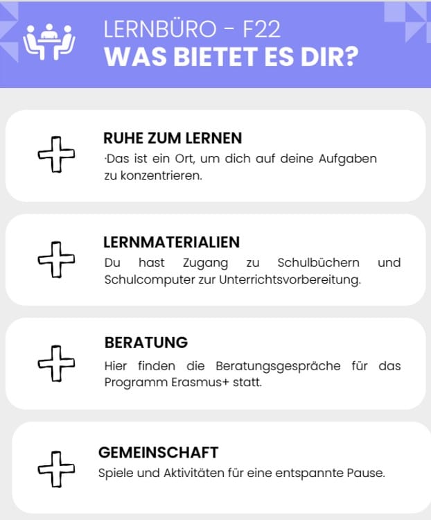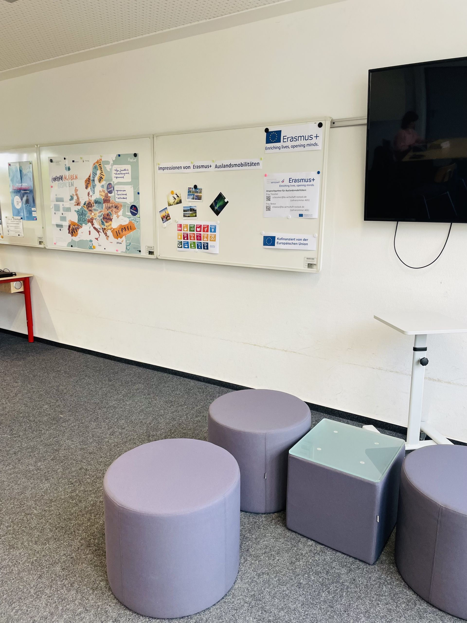 Was die letzten Jahre also Medienraum für den Unterricht genutzt wurde, wird nun zum Lernzentrum: Im letzten Schuljahr begann die Ideenfindung, wie der Raum F22 neu eingerichtet und genutzt werden kann. Entstanden ist daraus ein Lernzentrum, das allen Schülerinnen und Schülern der Berufsschule und des Beruflichen Gymnasiums zur Verfügung steht. Die Nutzungsmöglichkeiten sind vielfältig: Der Raum kann zum gemeinsamen Lernen genutzt werden oder zur Freizeitgestaltung in Freiblöcken. Lehrbücher und Spiele stehen zur Verfügung und können selbstständig genutzt werden. Zudem wurde ein Raum geschaffen, um Beratungsgespräche für die Auslandsmobilitäten im Rahmen von Erasmus+ durchzuführen. Ansprechpartner für Fragen zur Nutzung ist Herr Schuty, [...]